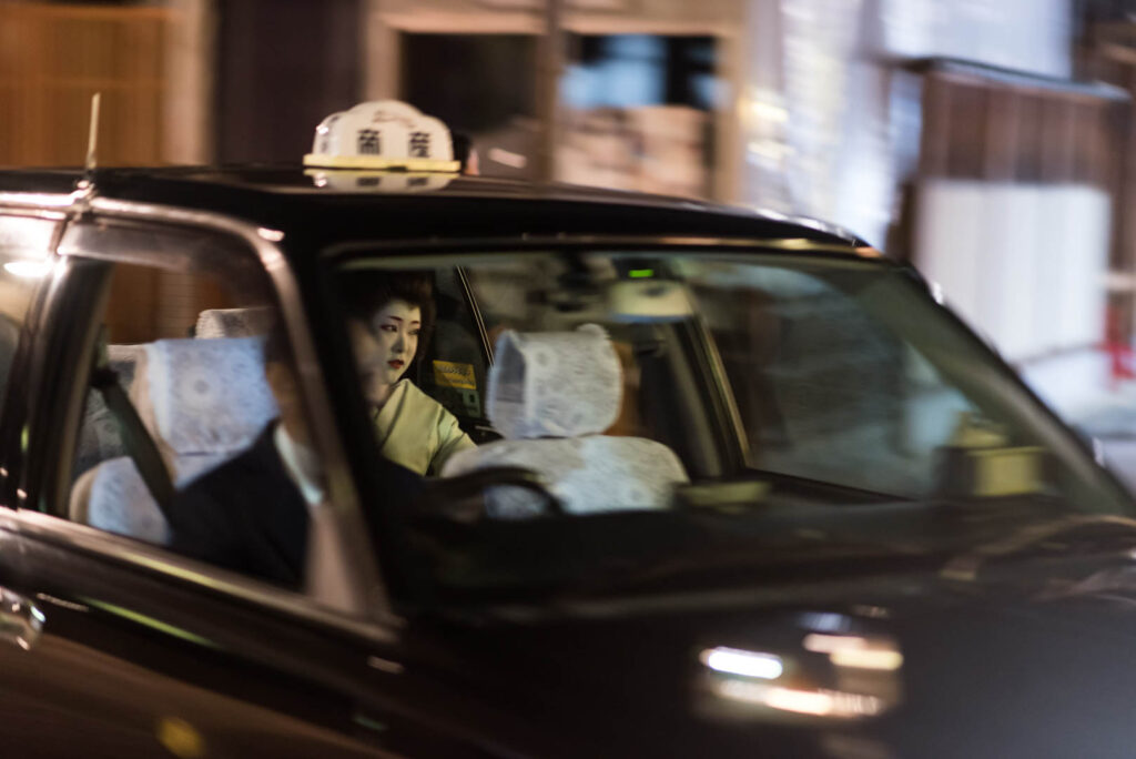 While walking in Gion, Kyoto, I wasn’t lucky and didn’t see any maiko. Maiko are young women studying to become geiko (called geisha in most of the world, but not in Kyoto, Japan). Then I saw one person going out from a house and walking toward a taxi. I replaced my lens fast, changed the settings, and managed to take this photo in movement.