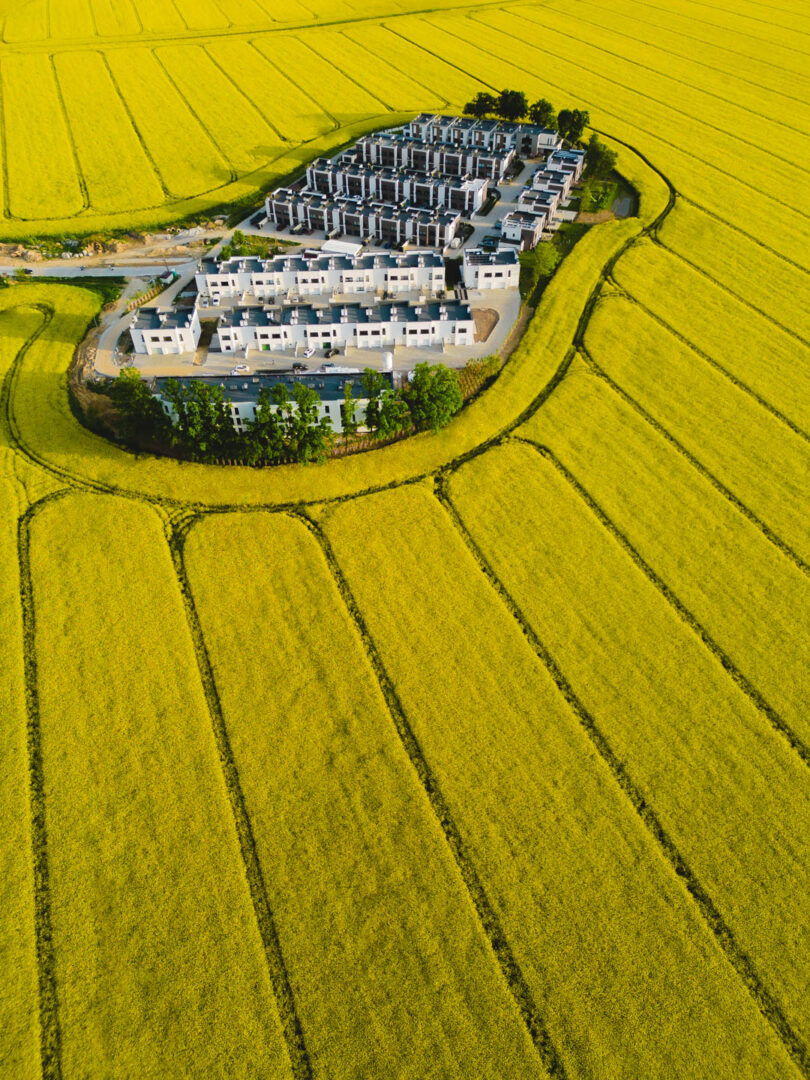 Inspired by yellow colour I decided to take a photo with a drone showing an aerial perspective of a small settlement of the city of Swidnica, Poland, which was built in the middle of a field. In the spring months the buildings are surrounded by beautiful rapeseed fields.
